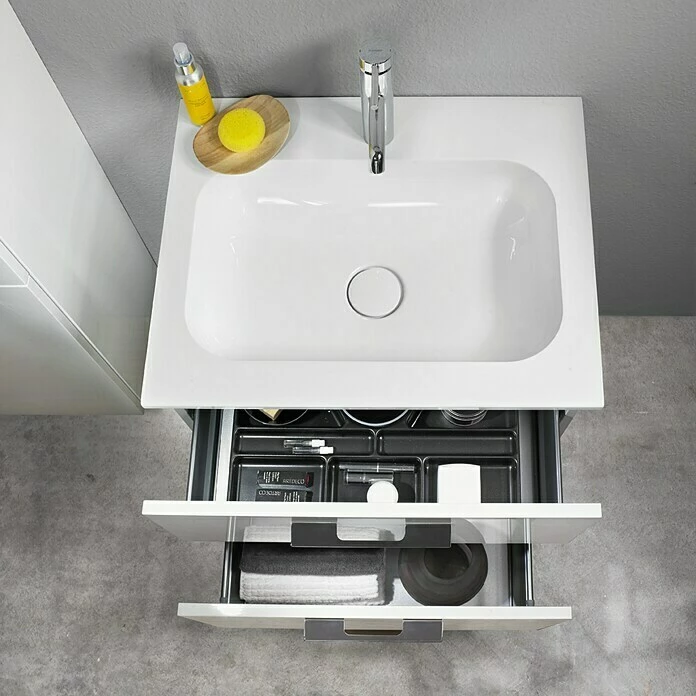 Der Waschtisch Aurinia von Camargue bildet mit dem passenden Waschtischunterschrank eine harmonische Einheit. Der Waschtisch aus Mineralguss überzeugt durch eine solide und leicht zu reinigende Oberfläche. Darüber hinaus ist er werkseitig bereits mit einem durchgestochenen Hahnloch und außerdem dem Ab- und Überlaufsystem Clou von Geberit versehen. Des Weiteren ist der Waschtisch ideal mit einer Armatur kombinierbar. Mit dem ebenfalls erhältlichen, nicht im Lieferumfang enthaltenen Unterschrank und Lichtspiegel, schaffen Sie ein harmonisches Gesamtbild.
