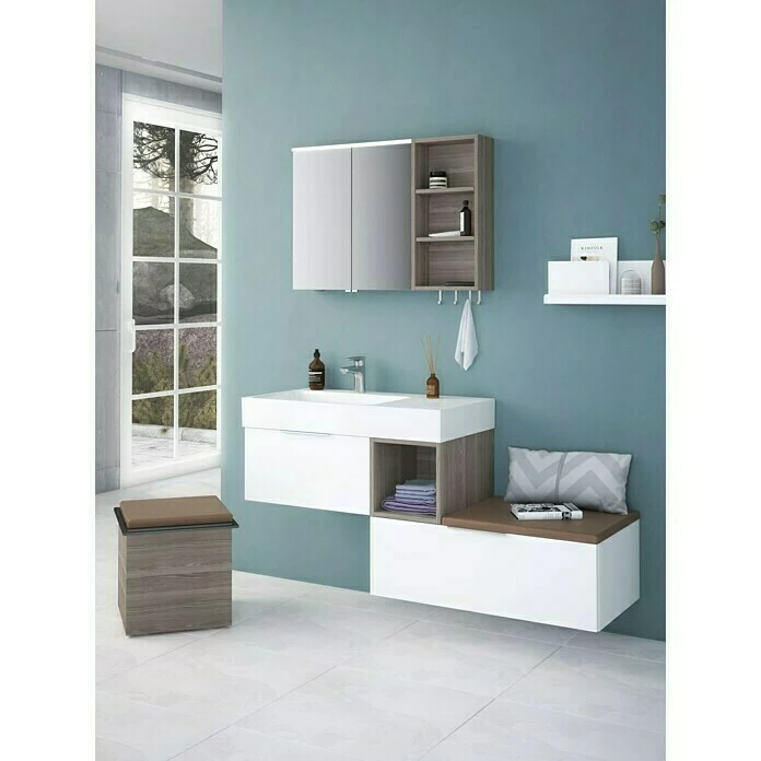 Der Waschtisch Cube von Camargue lässt sich harmonisch mit dem passenden Unterschrank kombinieren. Es überzeugt mit seinen schmutzabweisenden Eigenschaften durch eine hochglänzende, glatte und porenfreie Oberfläche. Der Waschtisch ist ein Teil des innovativen Baukastensystems, mit dessen Sie unzählige Module und Elemente ganz frei zu einer individuellen Badeinrichtung verbinden können. Dabei glänzt die Serie Cube mit raffinierten Details und funktionalen Badmöbeln. Ob stillvoller Spiegelschrank mit LED-Aufsatzleuchte, Leuchtspiegel, praktischer Rollcontainer, die einladende Sitzbank oder der weiße Waschtisch aus Mineralguss – Cube präsentiert sich zeitgemäß und alltagskonform. Auch bei der Möbelfarbe der Serie Cube haben Sie die freie Wahl zwischen Eiche Cordoba oder hochglänzendem Weiß.