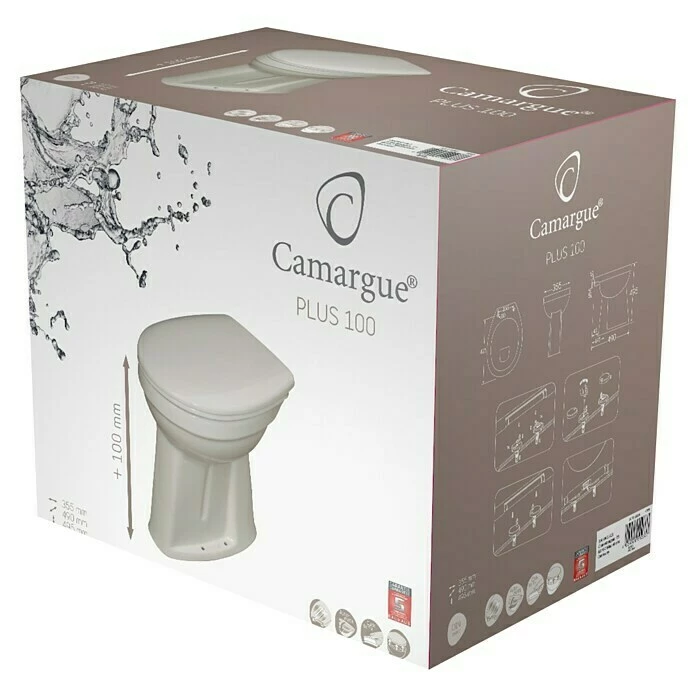 Das Stand-WC-Set Plus 100 von Camargue ist die minimalistische Lösung für das Badezimmer. Durch das Design inklusive geschlossenem Spülrand erfolgt eine flächendeckende Spülung. Die leistungsstarke Spülung hat einen Bedarf von 6 Litern. Die Sitzposition ist um 9,5 cm erhöht. Der passende WC-Sitz aus Duroplast mit Absenkautomatik komplettiert das WC. Das notwendige Montagematerial kann separat erworben werden.