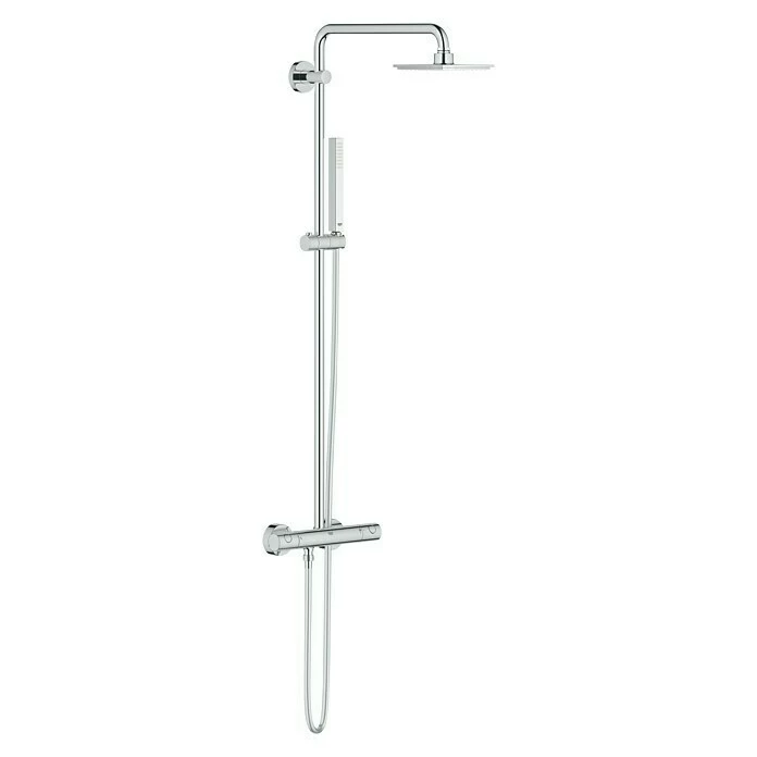Das Euphoria Duschsystem 150 von Grohe mit Thermostat liefert überragenden Duschkomfort. Sichergestellt durch die Grohe TurboStat Kartusche, hält das Thermostat die Temperatur konstant auf einem komfortablen Niveau. Die große Wellnesskopfbrause und die praktische Handbrause schaffen ein angenehmes Duscherlebnis. Der Umstellhebel ermöglicht den Wechsel zwischen Kopf- und Handbrause. Die DreamSpray® Technologie im Inneren der Brausen sorgt für äußerste Präzision und eine gleichmäßige Wasserverteilung auf jede einzelne Düse. Außerdem besitzen die Brausen eine Speed-Clean Funktion, die durch ihe integrierte Anti-Kalknoppen lästige Kalkablagerungen effektiv verhindern. Die Handbrause ist individuell höhenverstellbar mittels Gleitelement. Der flexible Brauseschlauch mit Twistfree verhindert effektiv das Verdrehen des Brauseschlauches. Die StarLight® Chromoberfläche liefert langlebigen Hochglanz.