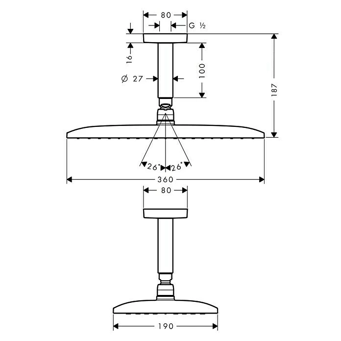 Das Kopfbrausen-Set Raindance E 360 von Hansgrohe begeistert mit klaren, eleganten Linien und einer schlanken Formgebung im besonders großen Format. AirPower reichert das Wasser mit Luft an, was das Strahlbild fülliger und weicher macht und gleichzeitig den Verbrauch senkt. Dank der Quick-Clean Funktion verschwinden lästige Kalkablagerungen im Handumdrehen: Rückstände können von den flexiblen Anti-Kalk-Noppen einfach abgerubbelt werden. Über ein Kugelgelenk ist die Kopfbrause im Winkel verstellbar. Die hochwertig verchromte Oberfläche ist besonders pflegeleicht und zur besseren Reinigung lässt sich der gesamte Strahlboden abnehmen. Im Set enthalten ist ein 10 cm langes Deckenanschluss-Element aus Metall, das mit seinem genormten ½“-Anschluss passgenau montierbar ist.