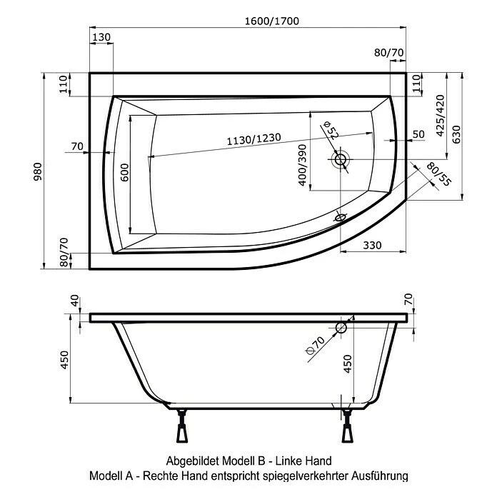 BAUHAUS Ottofond Badewanne Juno B Linksseitig, 160 X 98/63 X 45 Cm, Sanitäracryl, Weiß