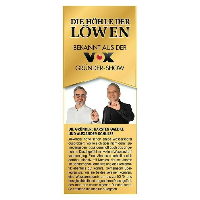 Der Dusch-Wassersparer puregreen, bekannt aus der TV-Show “Die Höhle der Löwen”, passt nahezu auf alle Duscharmaturen & Kopfbrausen. Sie können im Vergleich zu Standard-Duschbrausen bis zu 50 % des herkömmlichen Wasserverbrauchs sparen. Für die leichte Installation benötigen Sie kein Werkzeug: einfach per Hand festdrehen – fertig! Der puregreen Wassersparer spart Wasser, Geld und erhält das Duscherlebnis! Er enthält eine Verwirbelungsdüse zum einfachen Einsetzen zwischen Duscharmatur und Duschschlauch oder vor der Kopfbrause. Einfach aufschrauben – fertig. Dank der speziellen Technik wird das durchfließende Wasser mit Luft verwirbelt und erneut beschleunigt. So bleibt das Duschgefühl gleich. Sie haben weiterhin das Erlebnis von einem vollen und starken Wasserstrahl. Dennoch wird der Wasserverbrauch deutlich gesenkt. Er spart wertvolle Ressourcen und schont den Geldbeutel.